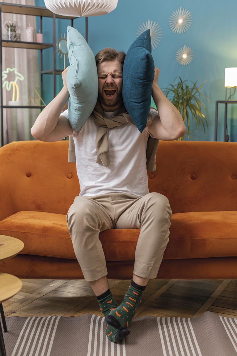 Repair work at neighbours concept, irritated man at home cover ears with pillows annoyed by noise