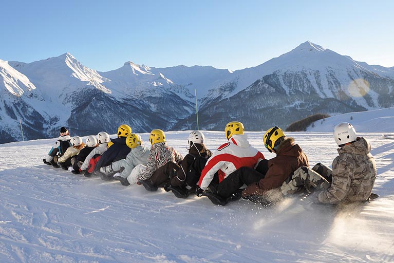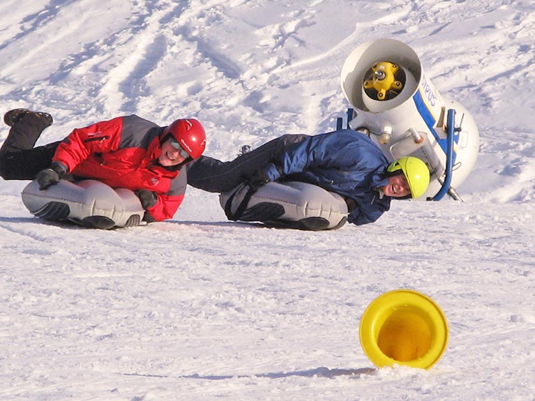 16h : le soleil commence à décliner, filons à Luz-Ardiden pour essayer la piste de snowtubbing : assis (ou debout, sur le dos, sur le ventre…) sur une grosse bouée, on a adoré descendre les pistes à toute allure en pivotant sur nous-mêmes comme des derviches tourneurs… Résultat ? Une bonne gamelle bien méritée, tête la première dans la neige, pour notre plus grand bonheur. Oui, nous sommes de grands enfants.