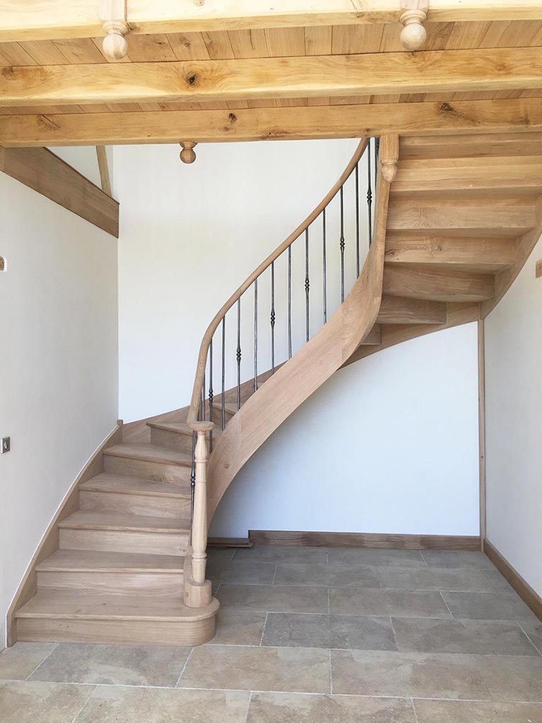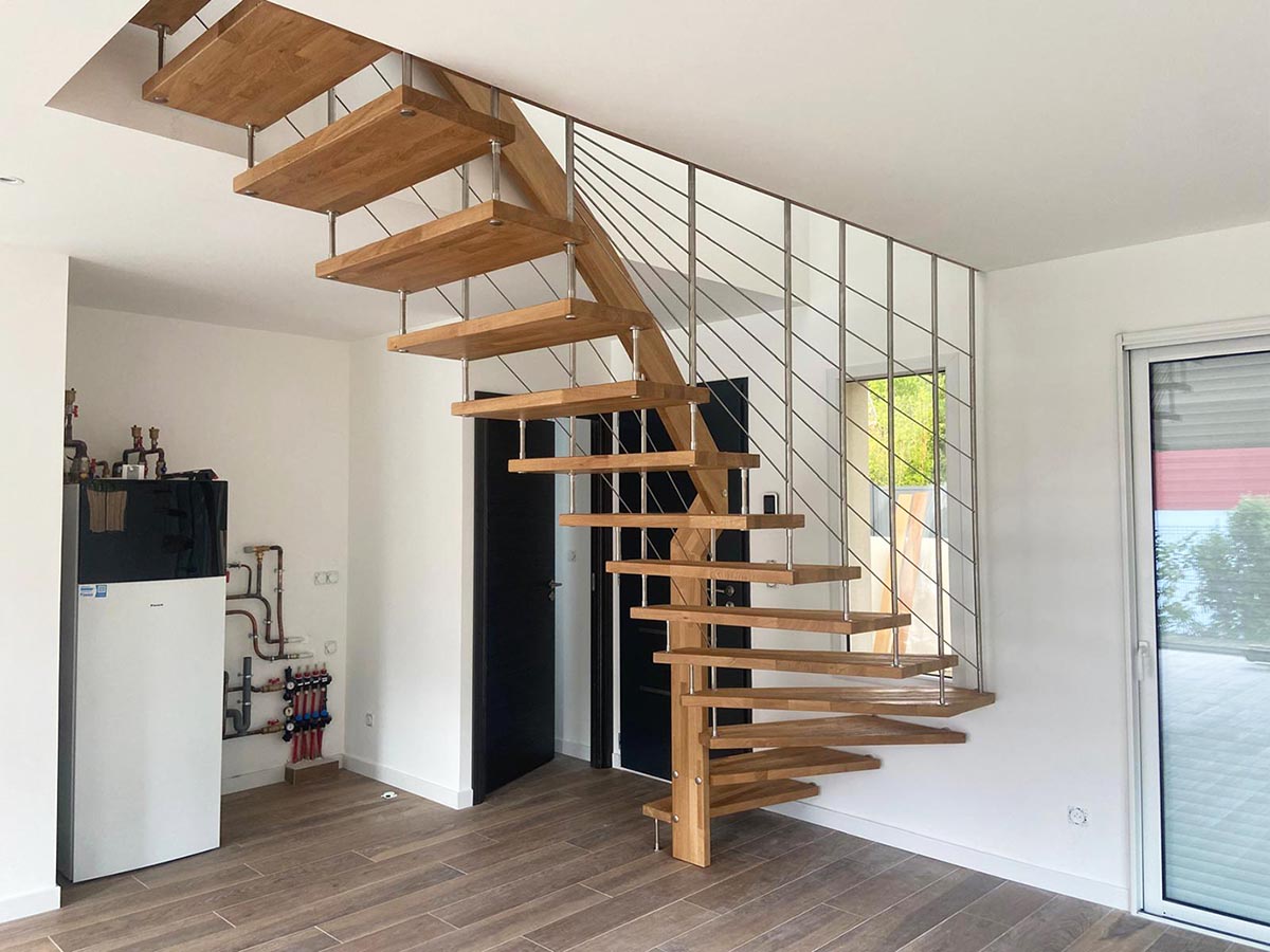 L’entreprise conçoit trois grandes familles d’escaliers : les escaliers traditionnels, les débillardés et les suspendus. Les traditionnels, ce sont les escaliers que l’on connaît tous, à la fois robustes et intemporels, le plus souvent construits en bois massif ou en métal. Les débillardés sont courbes : les marches et les limons suivent une forme non rectiligne. Quant aux suspendus, comme leur nom l’indique, ils sont plus techniques et innovants. Quel que soit le style que vous choisirez, vous avez la garantie que votre escalier sera conçu avec des matériaux sélectionnés pour leur qualité : bois labellisés, métaux durables, finitions soignées. Autour des escaliers, l’équipe conçoit également des garde-corps, des rampes et des structures pour mezzanines ou terrasses, en bois, acier ou alu. N’hésitez pas à les contacter pour discuter de vos projets !
