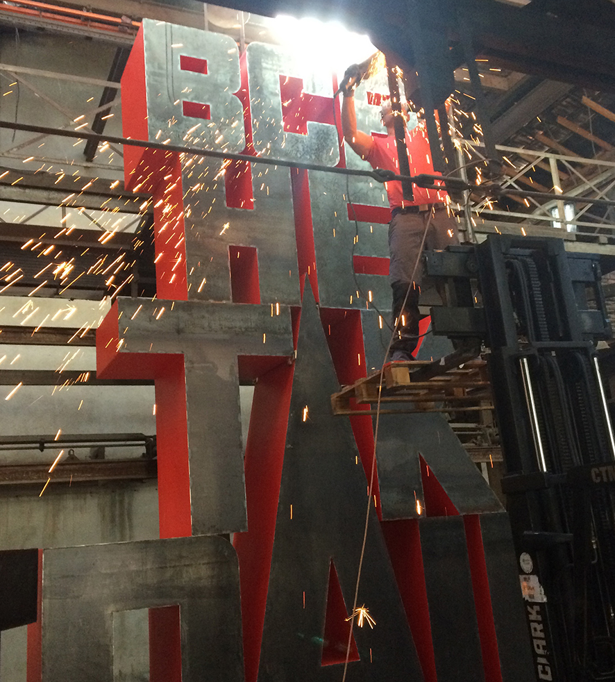 Un travail de rénovation colossal a été réalisé. Tout a été remis à neuf avec la volonté de conserver l’âme de la fonderie : « Il était très important pour nous de tout garder comme avant ». Les dimensions industrielles des lieux sont parfaitement adaptées aux œuvres de Molodkine, qui sont particulièrement volumineuses. À l’intérieur comme à l’extérieur des bâtiments, plusieurs dizaines de lettres immenses en trois dimensions forment des phrases lourdes de sens. Exemple : disposées en un cercle de plusieurs dizaines de mètres de diamètre, des lettres de quatre ou cinq mètres de haut font apparaître la phrase « Tired of this global sadistic regime », autrement dit : « fatigué de ce régime sadique mondial ». Molodkine a subi de nombreuses pressions et censures en raison de ses prises de position. Son engagement artistique n’a rien d’une posture : c’est une réalité.