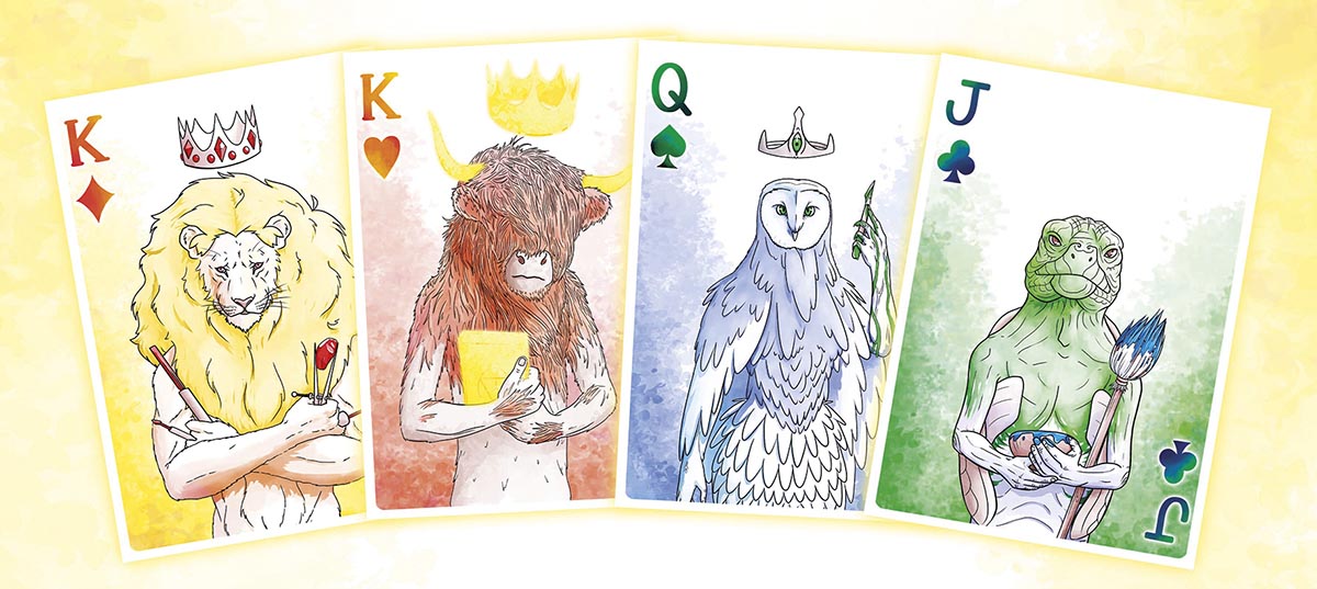 Animalumis est un jeu de 54 cartes classique : « On a voulu faire avant tout un beau jeu, autour du thème des animaux étranges et mystérieux », nous ont expliqué les deux artistes. Ils ont associé leurs compétences et se sont partagé les tâches : Lucie a fait les dessins, et Alan a géré la partie concept et les couleurs numériques : « Chaque famille de cartes a un symbole qui lui est propre. Par exemple, pour la famille cœur, il s’agit de l’auréole : l’as de cœur porte une auréole, le dix de cœur en porte dix, etc. ». Les prototypes sont déjà réalisés, il ne reste plus qu’à passer à l’étape de fabrication. Un livre sera également publié : il contiendra les illustrations du jeu, ainsi que la genèse de l’aventure Animalumis.