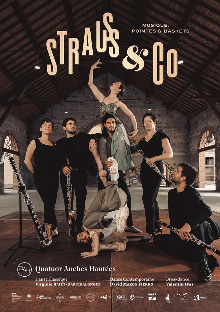 Vous préférez la musique et la danse… Alors rendez-vous avec le Quatuor Anches hantées pour STRAUSS & CO. Trois danseurs, dans un ballet de hip-hop, de danse classique et contemporaine, qui questionnent les quatre musiciens sur la perméabilité des genres.