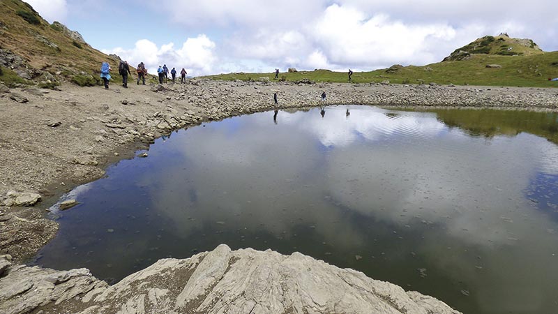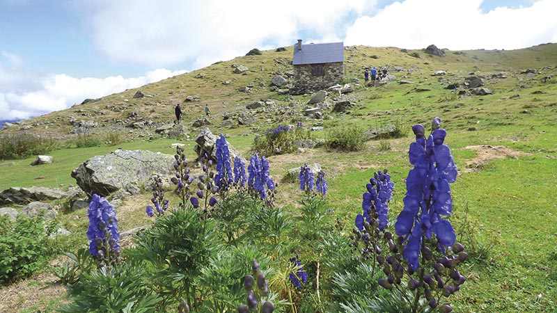 Soudain, la splendeur de la nature pyrénéenne s’offre à nous de manière inattendue : de magnifiques fleurs bleues jonchent le chemin, étirant vers le ciel leurs longues tiges aux grappes de pétales bleutés. Ce sont des Aconit Napels, réellement splendides, mais méfions-nous de la beauté : cette plante est hautement toxique, c’est un poison pouvant entraîner chez l’homme une mort rapide. Donc faites comme nous : observez-les, prenez-les en photo, mais ne les mangez pas, merci. Au bout d’1h30 de marche, on arrive au lac d’Arou, et pour tout vous avouer, on lui a trouvé une bien triste mine : son niveau d’eau est extrêmement bas, c’est un niveau anormal pour la saison, et c’est l’une des conséquences de plus des épisodes caniculaires que nous subissons depuis le début de l’été.