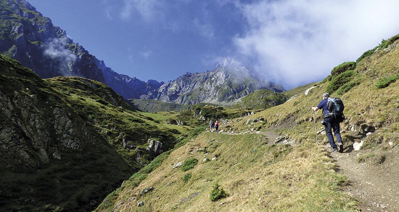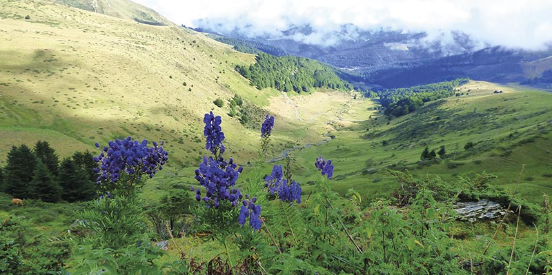 Après Payolle, juste avant d’arriver à Lesponne, on tourne à La Vialette et on se gare à la Hourquette d’Ancizan. Le temps est nuageux, les blousons sont de sortie, on avale le triple café noir habituel et l’on part tranquillement sur les sentiers en écoutant les chants des oiseaux pyrénéens. Très vite, le ciel s’éclaircit et l’ambiance se réchauffe ; on croise quelques vaches, et l’on se surprend même à échanger gaiement quelques mots avec elles. Sympas, les vaches de la vallée !