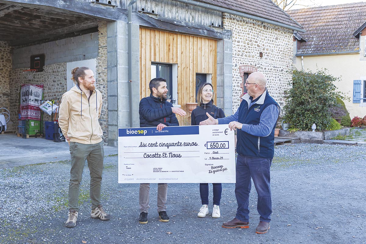 La visite s’est conclue par un excellent goûter (le Mag se souviendra longtemps du far breton aux pruneaux), accompagné de la remise du chèque issu du « Local Friday ». Les 24 et 25 novembre derniers, Biocoop avait organisé une opération de soutien aux producteurs bios locaux : les magasins s’étaient engagés à reverser à des acteurs bio la marge réalisée sur les achats de produits locaux pendant ces deux jours. Deux projets ont été soutenus : le projet d’agroforesterie de Jean-Yves et Caro, qui consiste à planter mille arbres et arbustes sur la propriété, et le projet de rénovation du Fournil d’Antan. 1300 € ont été recueillis par les Biocoop de Tarbes : Jean-Yves & Caro se sont donc vu remettre un chèque de 650 € pour les soutenir dans leurs futures plantations. Au-delà de l’opération Local Friday, les deux magasins Biocoop de Tarbes s’engagent quotidiennement aux côtés des acteurs locaux, en travaillant tout au long de l’année avec plus de cent producteurs locaux de tous métiers (maraîchers, boulangers, éleveurs, apiculteurs, vignerons, etc.).