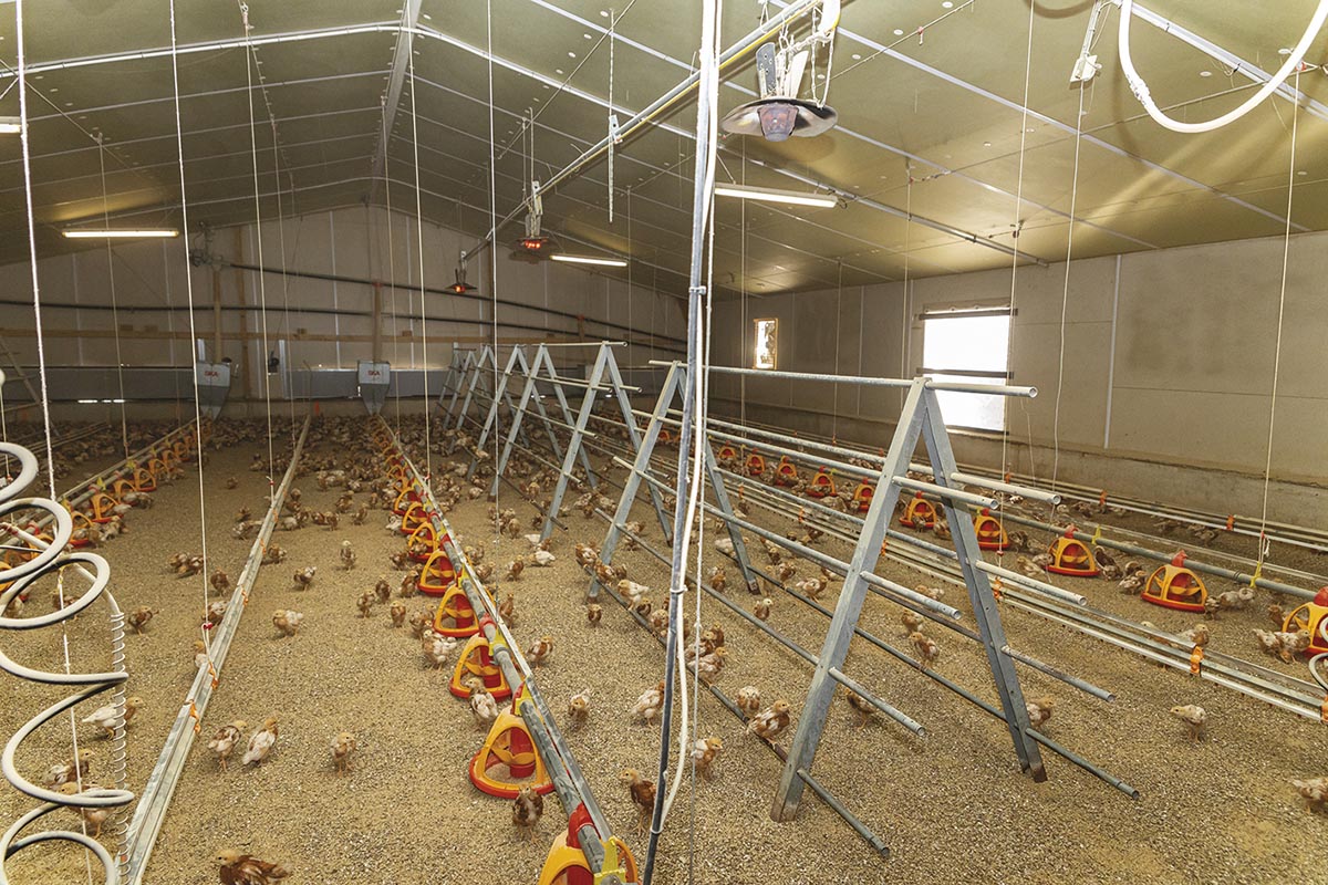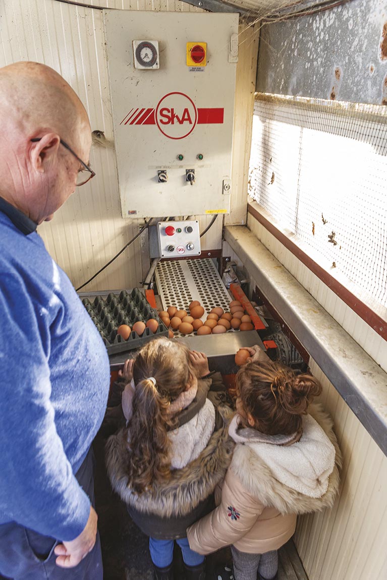Jean-Yves est arrivé de Bretagne en 2002. Il a commencé par l’agriculture conventionnelle, puis s’est tourné vers le bio en 2012. Depuis 2019, il produit des œufs : « On les vend à des magasins spécialisés comme Biocoop, à des restaurateurs, et à des épiceries de village, ce qui est très important pour le lien social », nous a-t-il expliqué. 3000 poules pondeuses sont réparties dans plusieurs bâtiments : « Nous avons également, depuis peu, un atelier de poussins : on souhaitait avoir nos propres poules pondeuses ».
