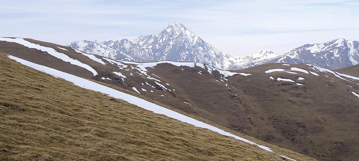 En contrebas, entre deux arbres de houx bourrés de petites boules rouges, on aperçoit le village des Esclozes, avec ses ruines abandonnées. Le soleil commence à taper, et nous voici à présent en tee-shirt avec les pieds dans la neige. La vue est splendide, le Pic du Midi se dresse dans le fond du décor, et on continue à s’enfoncer dans le paysage. Selon la météo, le ciel devrait se couvrir d’ici quelques heures, mais on a largement le temps. On finit par s’arrêter pour casser la croûte au niveau de Cot Dessus ; d’un coup, il commence à faire froid, le soleil file se planquer derrière les nuages et le vent se lève. Ne traînons pas.