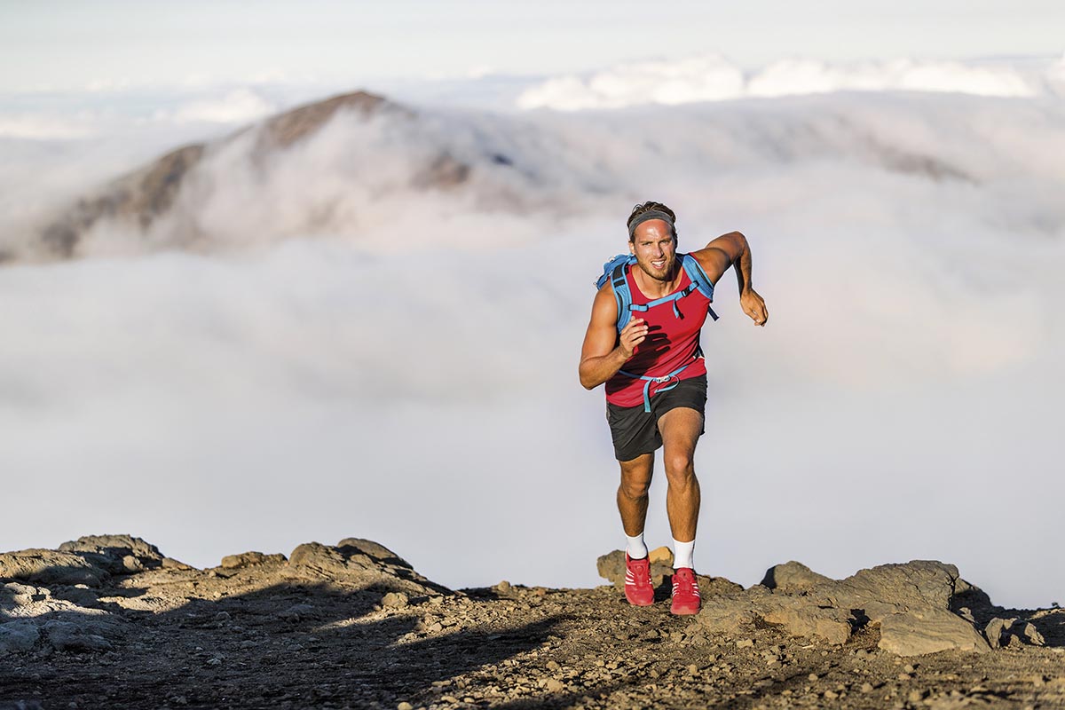 Runner trail running fitness man on endurance run motivation and concentration on race in sky and clouds background on nature landscape. Focused athlete with backpack and hairband training cardio.
