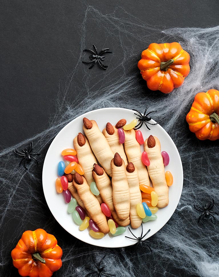 Sortez les boules du frigo et formez une trentaine de petits colombins irréguliers en forme de doigt. Disposez à chaque bout une amande effilée pour faire l’ongle. Incisez les doigts à l’aide d’un couteau pour représenter les phalanges. Enfournez 20 mn sur une plaque de cuisson recouverte de papier sulfurisé puis laissez refroidir afin que les sablés durcissent. Ne reste plus qu’à grignoter ces succulents doigts de sorcière…