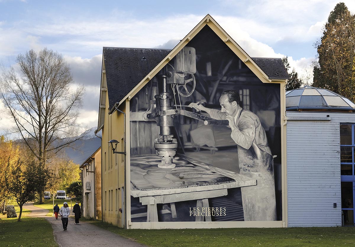 La fresque, peinte sur l’un des murs du bâtiment France Service, est à couper le souffle : elle mesure près de 12 mètres de haut, s’étale sur plus de 100 m2, et est d’un réalisme absolument bluffant. Elle représente une scène de travail dans celle d’un ouvrier de l’ancienne marbrerie bagnéraise.