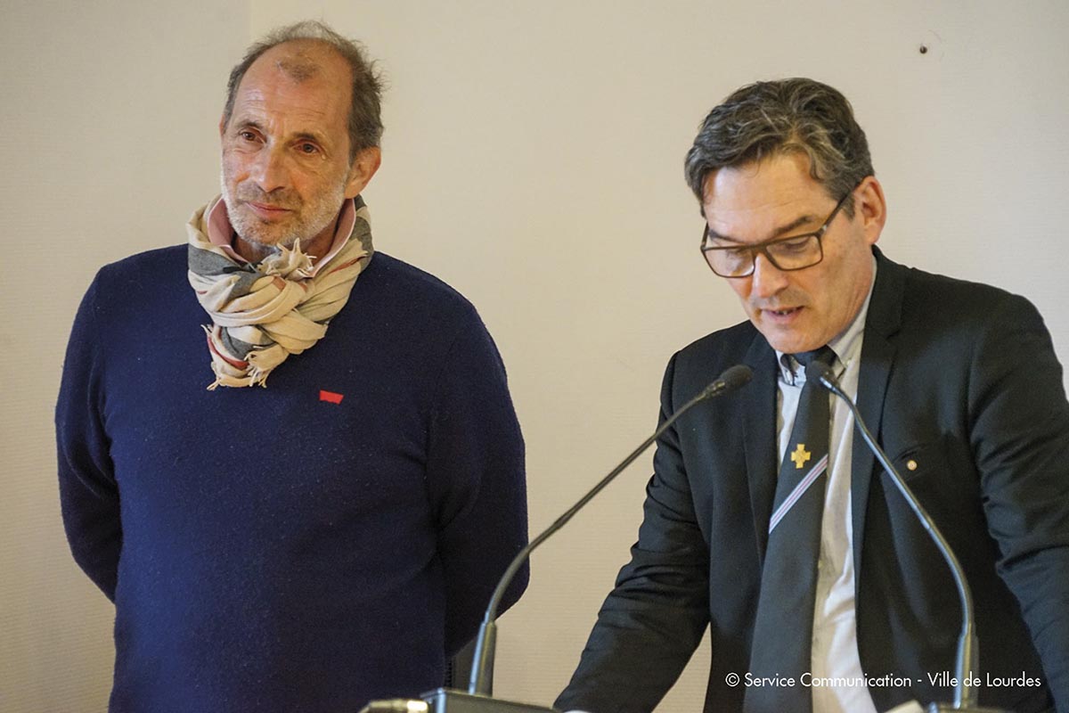 L’œuvre a été réalisée en fer recyclé : « Cet aigle est une force silencieuse forgée dans le fer de récupération. J’ai voulu rendre vivante cette matière humble, parfois blessée ». Jean-Claude est autodidacte. Il a développé sa sensibilité artistique à la suite d’une rencontre avec le Dalaï-Lama : « J’ai pu le rencontrer quand il est venu à Lourdes en 1993, et juste après, je suis parti voyager en Inde et au Népal. Je dormais chez l’habitant, j’ai fait pas mal de rencontres ; au lieu de prendre des photos, je me suis mis à dessiner, et une fois rentré en France j’ai commencé à sculpter et à peindre ». Thierry Lavit, maire de Lourdes, a chaleureusement remercié l’artiste lors de l’inauguration de la statue le 6 mai dernier. Une œuvre dédiée à la paix, c’est toujours un bonheur partagé : merci, Jean-Claude !