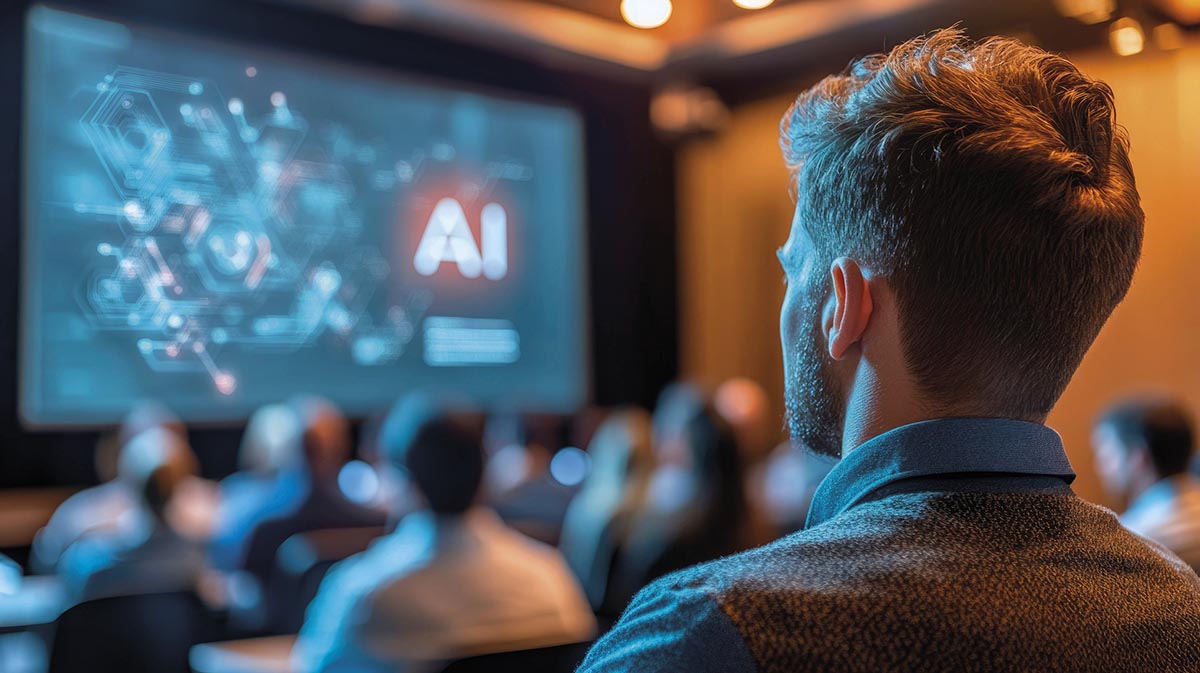Man Watching AI Presentation in a Conference Room