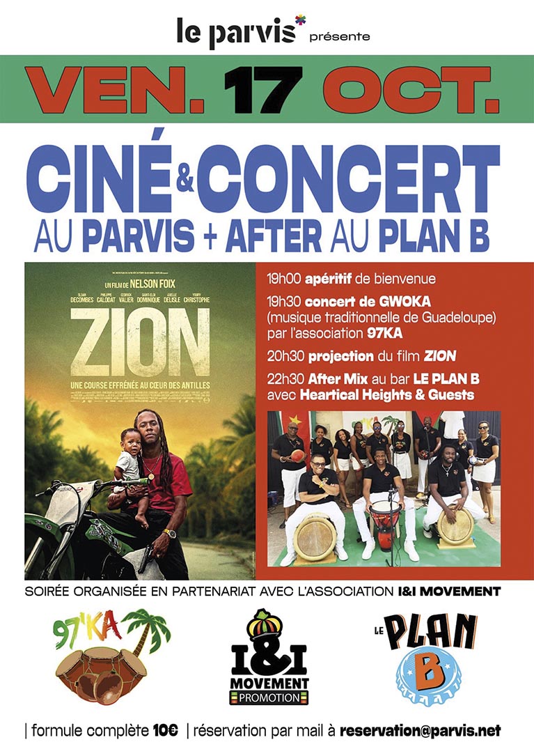 La soirée du 17 octobre est née d’un partenariat entre I&I Movement, Le Parvis, 97 KA (association culturelle tarbaise qui propose des événements autour du Gwoka, musique traditionnelle guadeloupéenne) et le Plan B. À 19h, Le Parvis accueillera le public avec un apéro offert, puis 97 KA fera une démo de percussions et de danses traditionnelles. Ensuite, place au cinéma avec la diffusion du film Zion, une fiction qui évoque la réalité de la jeunesse des DOM-TOM. Une fois le film terminé, direction le Plan B pour l’after avec deux Djs guadeloupéens invités par Heartical Heights : DJ Leta et DJ King, spécialisés dans le dancehall kreyol. N’hésitez pas à venir faire le plein de « vibes » ! (10 € – réservations par mail à reservation@parvis.net)