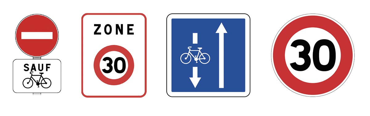 Grâce au plan vélo, les choses évoluent à Tarbes : dorénavant, certaines rues à sens unique où la vitesse est limitée à 30 km/h peuvent être empruntées dans les deux sens par les cyclistes. Comment les repérer ? Toutes les rues concernées sont équipées des panneaux ci-contre, qui signifient que les vélos ont le droit de circuler dans les deux sens. Pour plus de clarté, des pictogrammes « vélo » sont ajoutés sur la route.