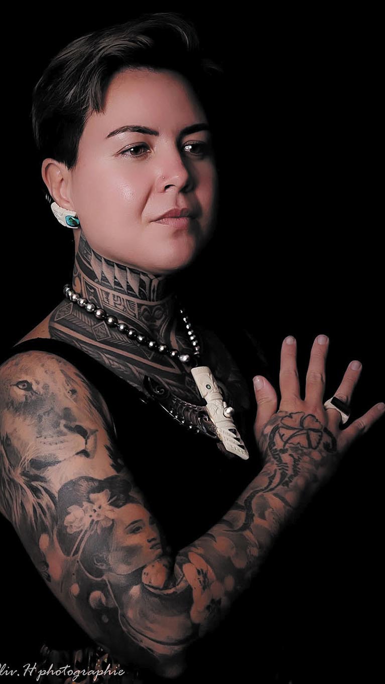 Audrey est originaire de Moorea en Polynésie, où la culture du tatouage est une tradition séculaire. Chaque motif dessiné sur la peau a une signification précise et raconte la vie de celui qui le porte.