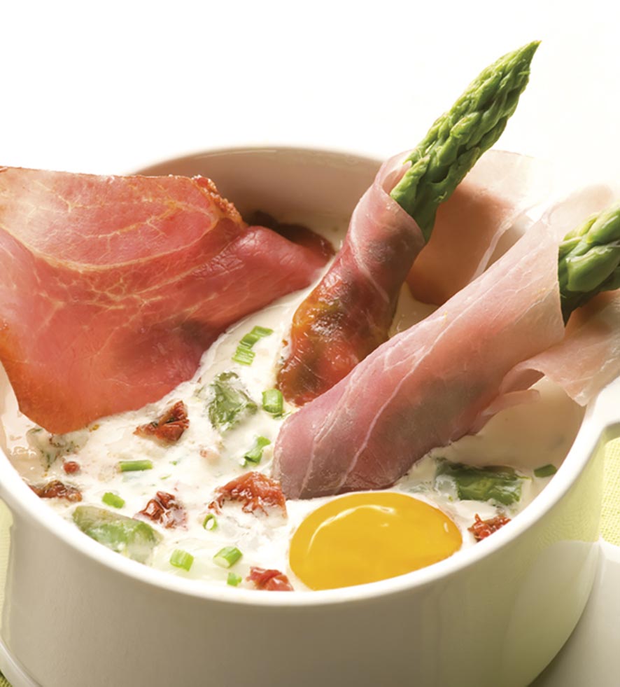 > Beurrez les ramequins. Répartissez les tomates séchées et les tronçons d’asperges. Cassez les œufs, ajoutez la crème fraîche, le curry. Salez et poivrez. Enfournez 15 min.