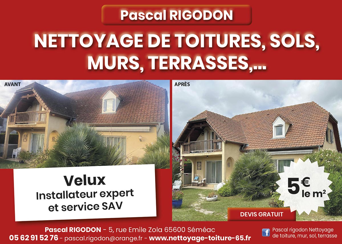 La période actuelle est idéale pour faire appel aux ­services de Pascal : son produit va attaquer les mousses, les algues, les lichens, les germes et autres micro-­organismes pendant tout l’automne, puis les précipitations hivernales débarrasseront vos surfaces des résidus de la bataille qui vient de se jouer. Votre toiture sera imperméabilisée pour l’hiver, et propre pour l’été. Et le Mag peut vous le dire : Pascal Rigodon remporte absolument toutes les batailles qu’il livre contre les mousses et champignons !