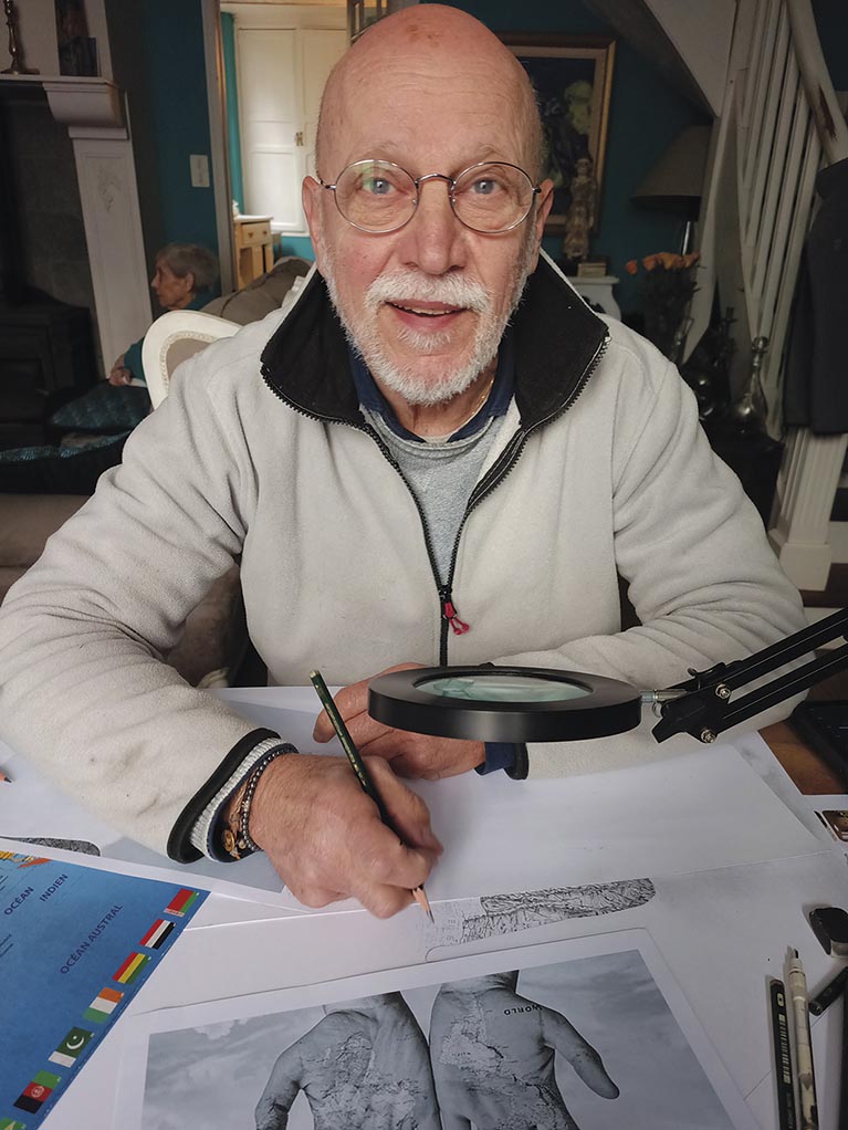 Pierre, qu’est-ce qui vous a poussé à vous mettre au dessin ? « Un jour, à Marrakech, j’ai eu envie de dessiner Marie-Pierre, mon épouse. J’ai acheté un crayon et une gomme, et j’ai été très surpris du résultat : c’était super ! À partir de là, je me suis mis à dessiner de plus en plus régulièrement. Aujourd’hui, je dessine tous les jours ». Vous êtes donc entièrement autodidacte ? « Oui ; je me suis inventé des techniques au fur et à mesure ». Pour plonger au plus profond de ses œuvres, Pierre a un outil spécial : « J’utilise une loupe assez puissante équipée de LED ; elle me permet d’aller vraiment dans les détails que l’on ne voit pas à l’œil nu ».