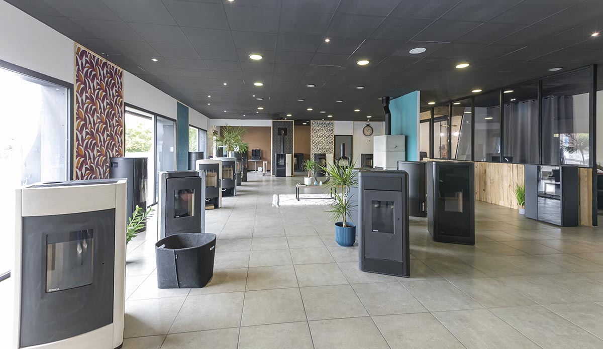 L’agence a entièrement fait peau neuve : en entrant, on a dorénavant une vue d’ensemble sur le showroom et les bureaux ; c’est spacieux, très aéré, et cela confère une atmosphère accueillante et conviviale des plus agréables. Vous souhaitez avoir une idée précise de ce à quoi ressemblera votre salon une fois équipé d’un poêle ? Le showroom permet, grâce à ses multiples ambiances, de s’immerger totalement et de visualiser le résultat final. Par exemple, les murs sont maintenant habillés d’une tapisserie différente derrière chaque poêle : « Les goûts et les couleurs sont très variés ; le fait d’avoir plusieurs ambiances permet de se projeter plus facilement ».
