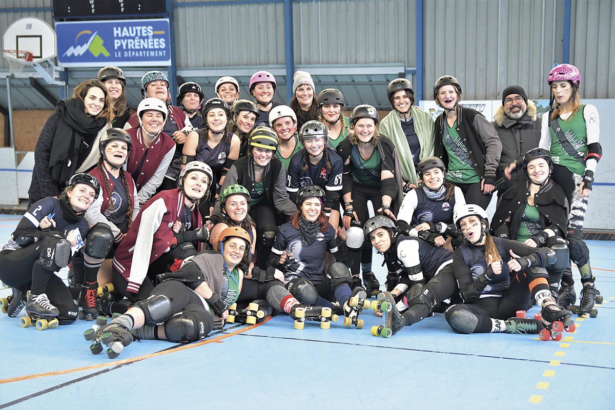 L’équipe tarbaise est composée d’une vingtaine de licenciées, de 18 à 40 ans. « L’équipe existe depuis dix ans, raconte Margot, certaines joueuses ont plusieurs années d’expérience, d’autres quelques semaines. » L’une des choses qui nous ont beaucoup amusés, ce sont les derby names : chaque joueuse choisit un pseudo (souvent à base de jeu de mots) inspiré d’un de leur trait de caractère, d’une anecdote, d’une référence à une célébrité… « Dans l’équipe, on a Jane Breakin’ (pour sa ressemblance avec la star), Élo 2 Vie (en référence à son penchant pour l’eau-de-vie), So Fear (alias Sophie), Éva PapaC, Maya La Breizh (qui vient de Bretagne), Totally Tchoin, qui est un remix entre les Totally Spies et… les tchoins (rires), etc ». Et votre derby name à vous, Margot ? « C’est “Peach Ass” : une pichasse, pour faire simple, c’est une blonde platine avec une Fiat 500. J’ai été blonde platine, j’avais une Fiat 500 rouge, donc mes amis m’appelaient Pichasse (rires). Et “Peach Ass”, c’est pour le jeu de mots avec “peach” (“pêche” en anglais) et… “ass” (rires). »