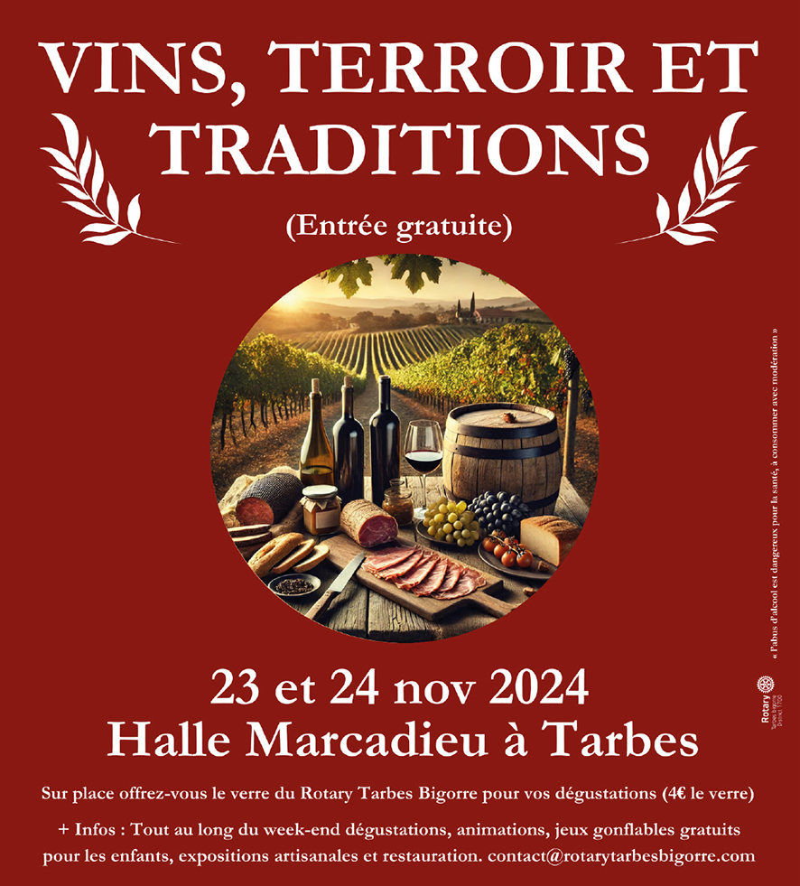 Attention, évènement : les 23 et 24 novembre, le Rotary Tarbes Bigorre organise la toute première édition de son Salon Vins, Terroir et Traditions. Un véritable tour de France du vin vous y attend !