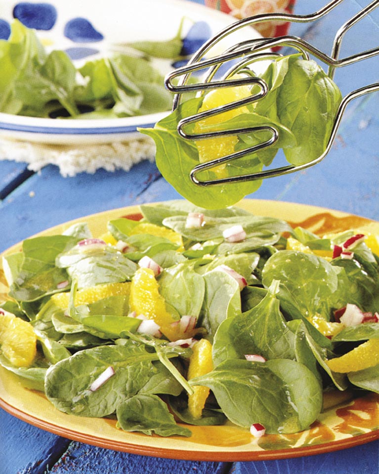 Mélangez les feuilles d’épinards avec les quartiers d’orange dans un plat de service. Ensuite, répartissez l’oignon émincé sur la salade.