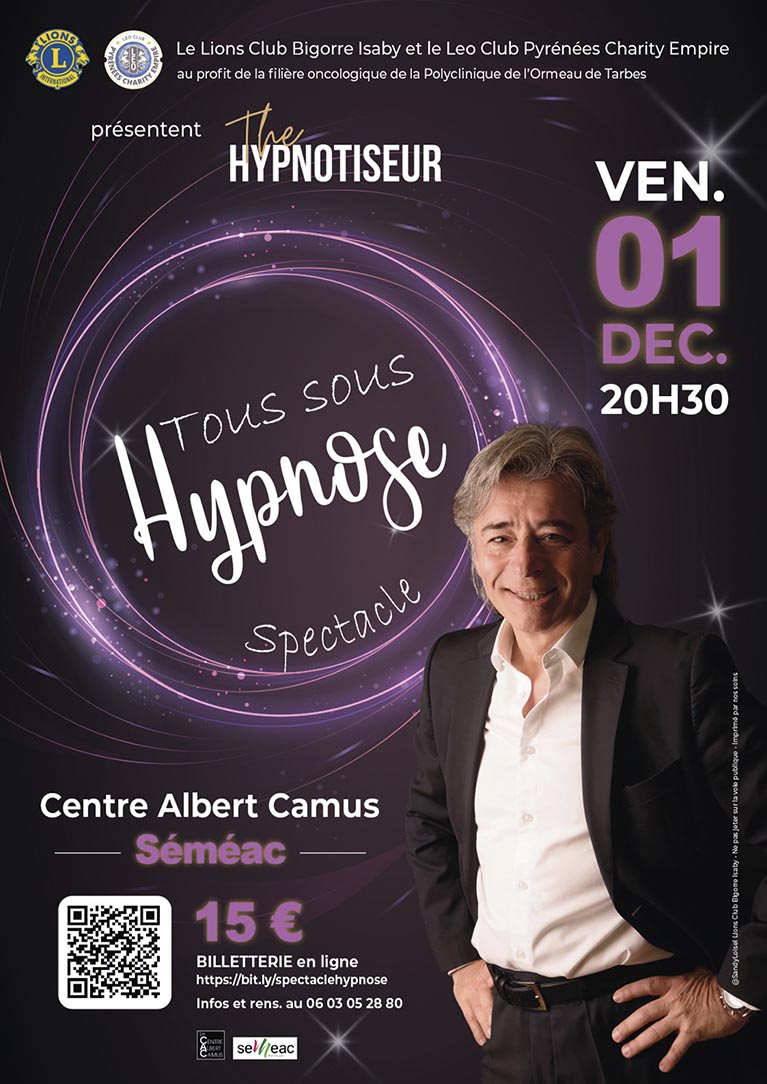 Précision importante : Tous sous hypnose est un spectacle caritatif organisé par le Lions Club Bigorre Isaby et le LEO Club Pyrénées Charity Empire. Les bénéfices de la soirée serviront à acheter du matériel pour le service oncologie de la Polyclinique de l’Ormeau de Tarbes. De l’hypnose pour la bonne cause !