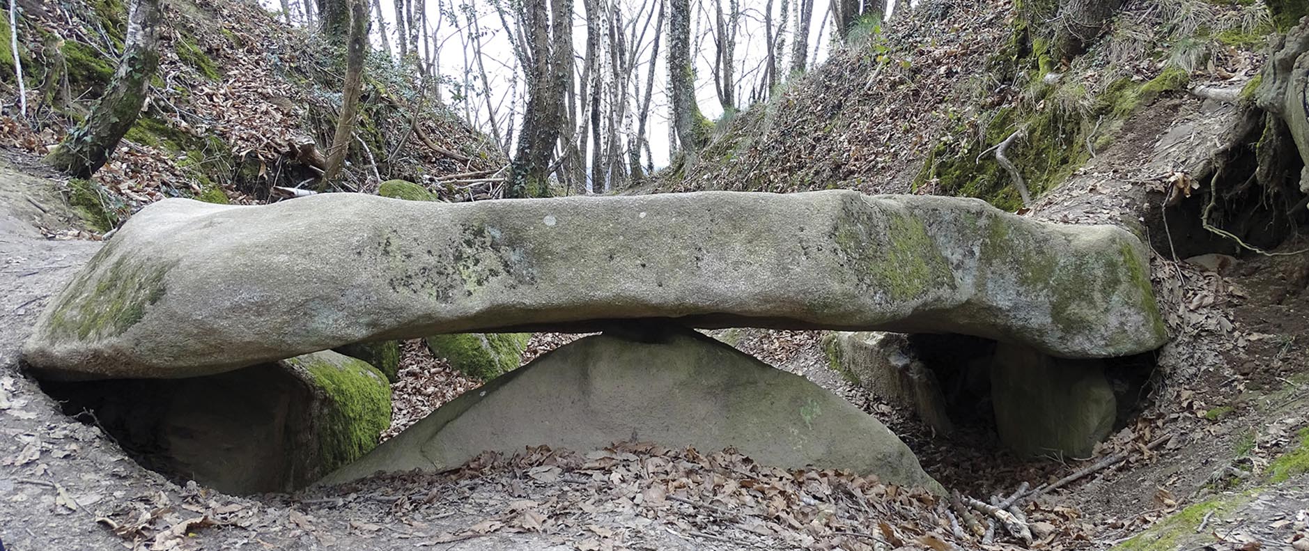 Quelques minutes plus tard, nous sommes à la sortie d’Ossun, sur la route de Pontacq. Nous bifurquons sur un petit chemin à droite ; une fois garés, nous remontons tranquillement le sentier jusqu’à trouver un petit panneau qui indique l’emplacement du dolmen. Au bout de quelques minutes de marche dans la forêt, nous arrivons enfin : le majestueux dolmen se dresse devant nous. Petite précision : un dolmen, c’est une structure mégalithique préhistorique formée d’au moins deux pierres verticales surmontées d’une dalle horizontale. Savez-vous pourquoi les ancêtres de nos ancêtres fabriquaient ce genre d’édifice ? Dans la majorité des cas, il s’agissait de monuments funéraires. Des tombes collectives. Oui : sous nos pieds se trouve un nombre considérable de restes humains, ossements ou cendres issues de crémations. Hum… D’un coup, l’ambiance se fait plus lourde…
