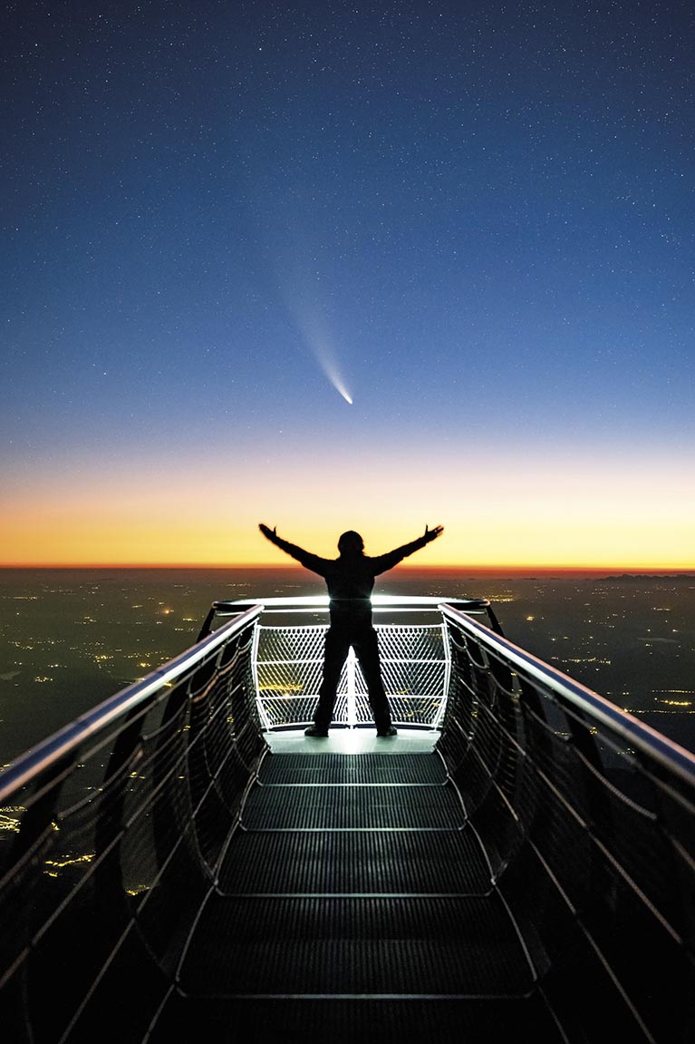 Lorsque nous avons demandé à Yannick quel était son meilleur souvenir dans les Pyrénées, il nous a répondu sans hésiter : « C’était en 2021, lors du passage de la comète Neowise. Il se trouve que ce jour-là, l’équipe du pic du Midi m’avait invité à faire des photos de nuit : la date était calée depuis plusieurs mois, et j’ai appris que la comète allait passer précisément ce jour-là ! ». Rappelez-vous, lecteurs : le hasard n’existe pas. « J’avais travaillé toute la journée à l’usine, de 4h à 14h ; en sortant, je suis monté directement au Pic, j’ai tout préparé, et j’ai attendu toute la nuit ». Yannick avait calculé que la comète passerait au-dessus de lui vers 5h30 du matin ; quand l’heure est arrivée, il a réglé son matériel, il a mis le retardateur, il est allé se placer sur le fameux ponton du Pic, il a écarté les bras, et… la magie a opéré : « C’était incroyable. Selon les scientifiques, elle aurait dû être très peu visible, mais elle est devenue de plus en plus lumineuse. J’ai réussi à être au bon endroit au bon moment ; quand j’ai vu le résultat sur l’appareil photo, j’ai sauté partout, j’étais comme un fou ! ». Cette photo (voir ci-contre) a été largement relayée sur les réseaux, notamment par le pic du Midi, le Département, Canon, mais aussi par France 3 qui a réalisé un reportage sur le travail de Yannick. « C’était épique ! »