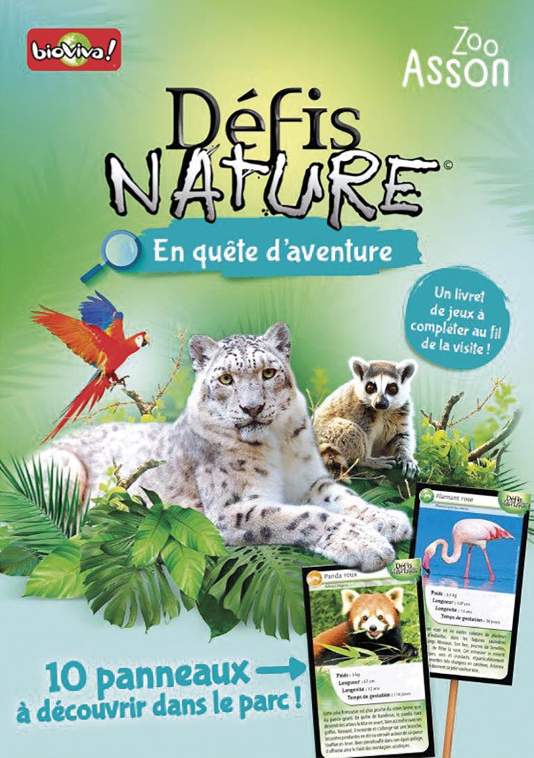 Pour mettre en place ce tout premier jeu de piste « Défis Nature », le Zoo d’Asson s’est associé à Bioviva, l’entreprise numéro un dans le développement de jeux de société éco-conçus et fabriqués en France. Une fois de plus, le Zoo d’Asson innove en associant la richesse de sa biodiversité au savoir-faire reconnu d’un partenaire de renom : il s’agit de la toute première fois que Bioviva s’unit à un parc zoologique dans le but de créer un jeu « live », entièrement intégré à la structure et aux collections zoologiques ! Le concept « En quête de nature » a été conçu par les équipes de Bioviva pour fédérer toute la famille autour d’un jeu grandeur nature. Ce jeu a pour supports un livret d’enquête et 10 cartes géantes « Défis Nature » présentant des espèces observables au sein du Zoo.
